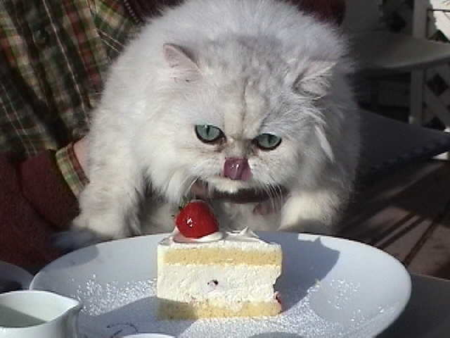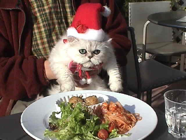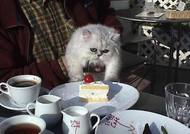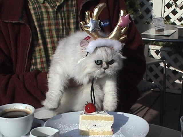 君子「おいしそうなショートケーキ。食べてもいい?ダメなの?!旅猫は、お外でお行儀良くしないといけないなんて・・・つらいわ。 隣のワンちゃん、何か食べてない?ねぇ、ねぇ。」 |