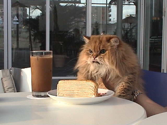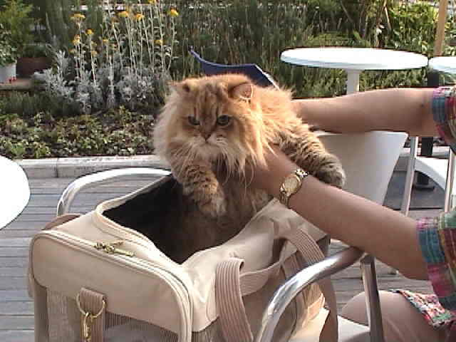 2001年6月9日撮影 センター北 CROSSES CAFE にて シャガール「駅前にはオープンカフェがたくさんあるけど、静かにお茶したい時は、ココがオススメだよ!人通りが少なくて、見晴らしもいいぞ。」 ハーブガーデンをバックにポーズ。 |