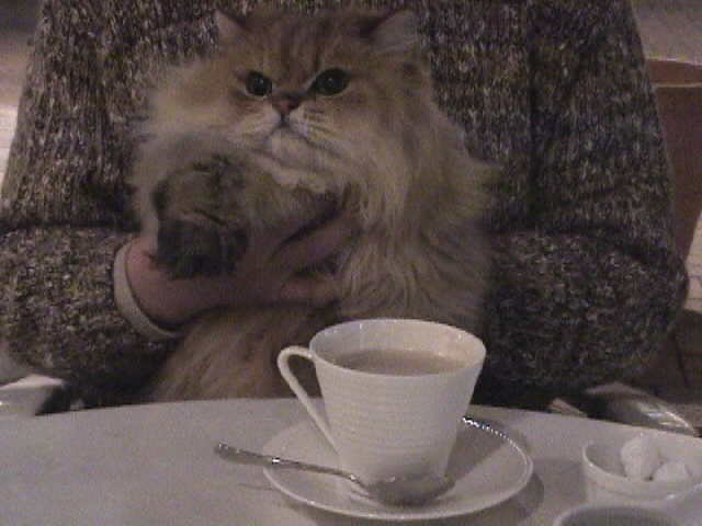 食事が終わり、コーヒータイム。 シャガール「コーヒーは好きじゃないけど、ミルクは大好き。でも、お外では飲まないようにしているんだ。」 |