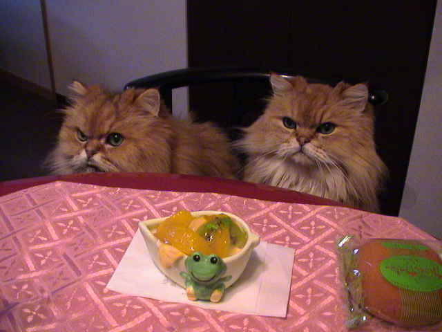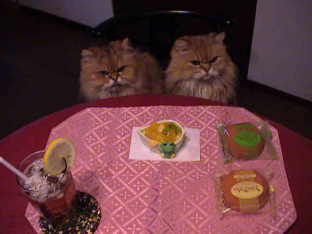 | 2003年4月27日撮影 リビングルーム 『カフェ・ド・クロちゃん』にて シャガール(右)「今日は、うちでティータイムの撮影なのか?」 クロード(左)「もう夕飯時じゃないの?」 |