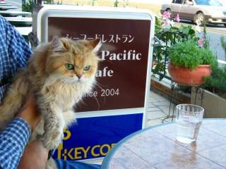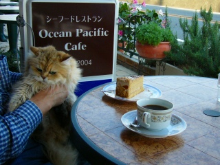 2005年10月25日(火) 晴れ 去年オープンした、国道135号沿いにあるシーフード・レストランです。”ペットはテラスにてどうぞ”の看板が出ているので、寄ってみました。 モネ「いつも通りがかるので、気になっていたのよね。何があるのかしら?」 |