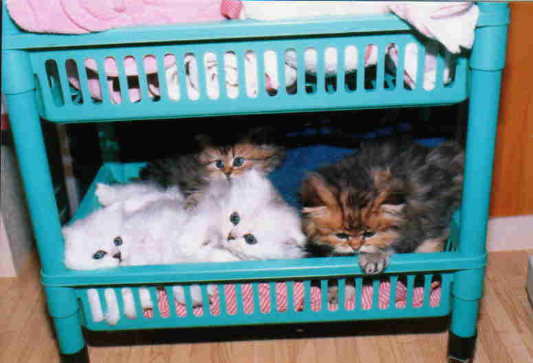 ミロパパとモモママの5匹の子供たち。ゴールデン2匹、シルバー3匹が誕生しました。 右のゴールデンがルソ君です。 この時から、トレードマークの「額に黒いチューリップ」模様がありました。 |