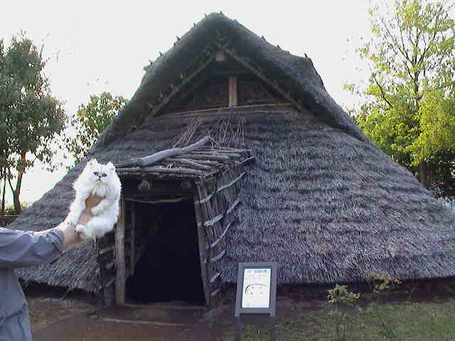 ブッキー「私の別荘で〜す。」 何だか合わない、ブッキーと縄文式住居。 |