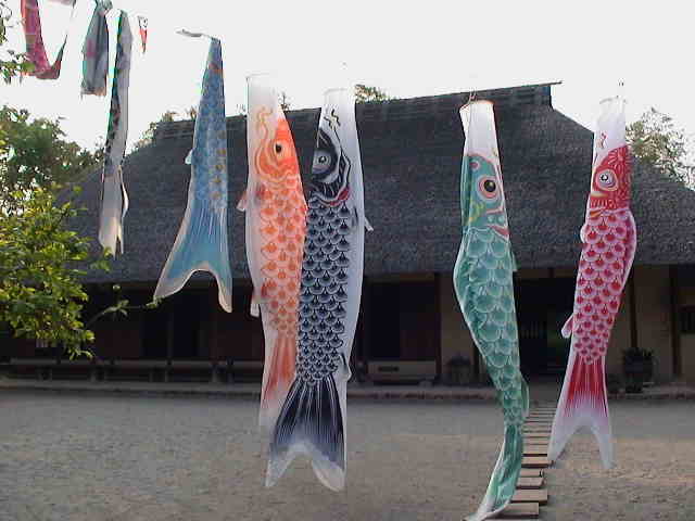 都筑民家園の庭に、大きな鯉のぼりが並んでいました。 ブッキー「1年に一度、お洗濯して干しているのね。ごくろうさま。」 そうではないと思うのだけれど・・・・。 |