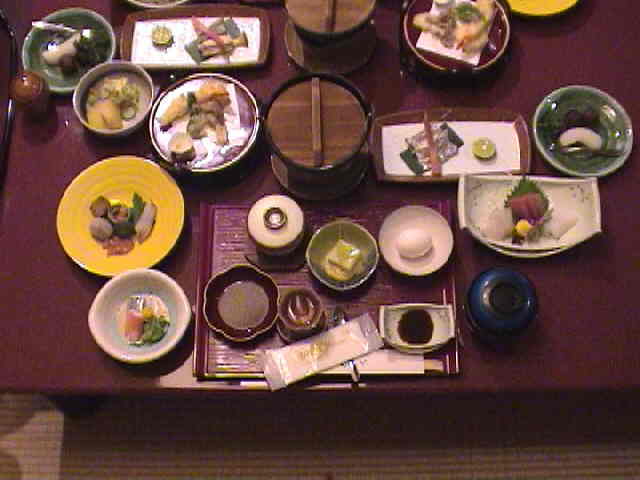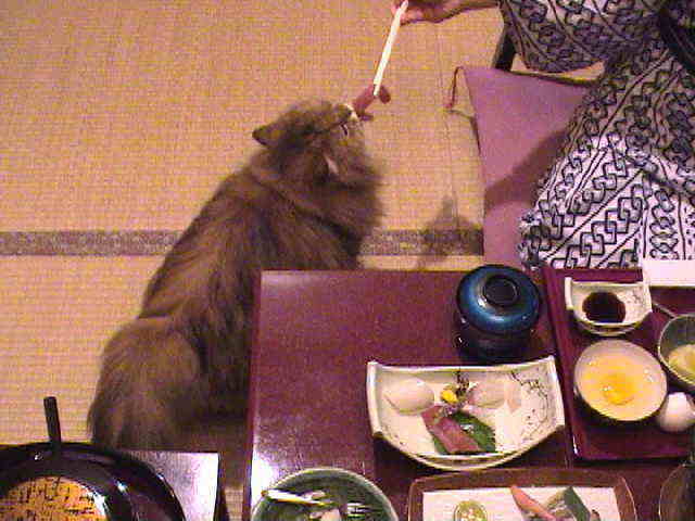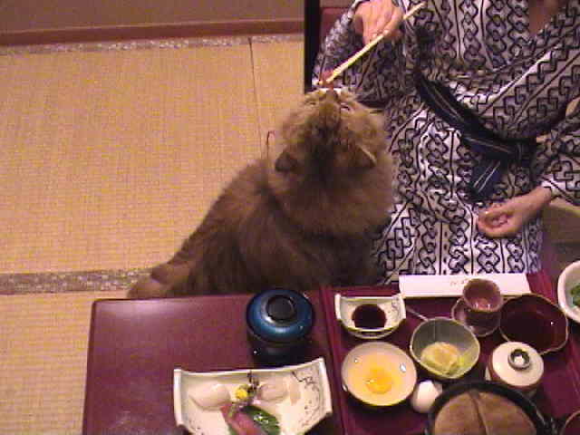 2000年10月2日(月) 雨 夕食だ!夕食は懐石料理。これだけではお腹が空くので、ケーキセットを注文する。 (ボク」たちはドライフードとお水で満腹だ。) |
