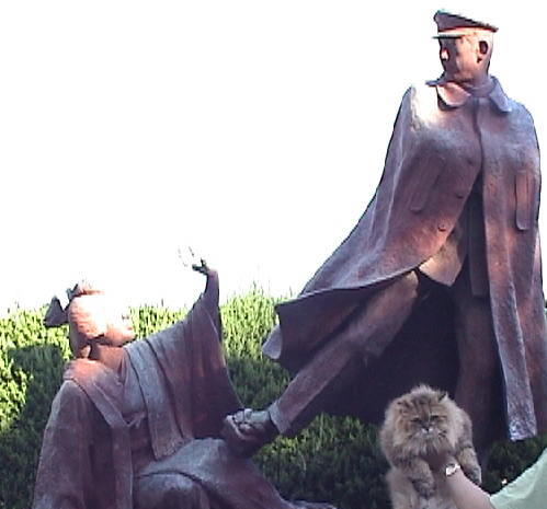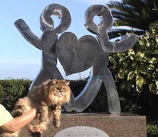 ルソー「熱海といえば、『金色夜叉』の”貫一とお宮の像”を思い出す人が多いんじゃないか?そのうち、”温泉宿で刺身を食す金色猫”の銅像ができるといいな。」 |