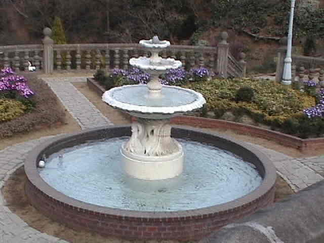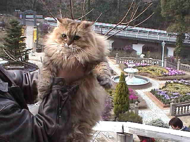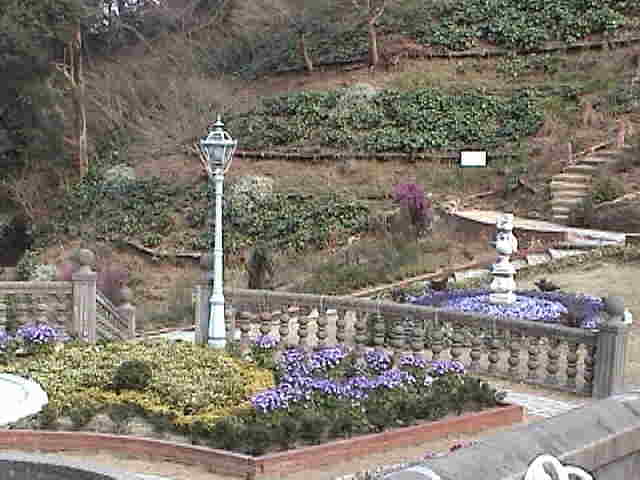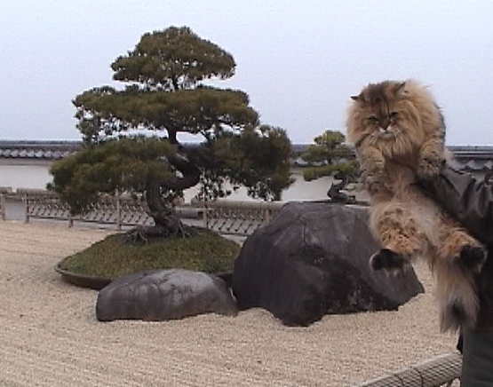 2002年2月26日(火) 曇り まずは、日本庭園『天翔』。 ルソー「何だか妙なショット。ボクたちが小さくなったわけじゃないよ!盆栽が大きいんだ。」 世界最大の松の盆栽は、何と、鉢ごと回転しています。 |