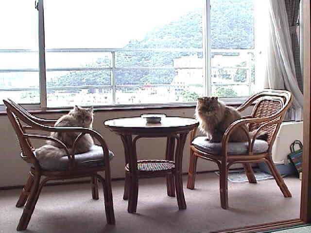 2002年6月28日(金) 曇り ルソー(右)&モネ夫妻 「みなさん、こんにちは! 今日は、河口湖にある、”花水庭おおや”さんの本館からの中継です。」 |
