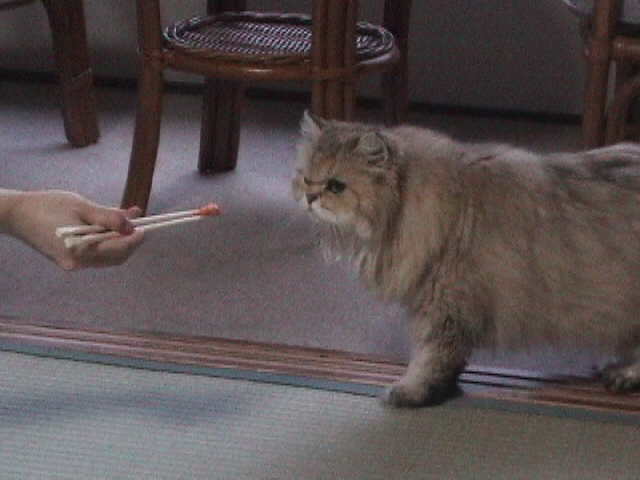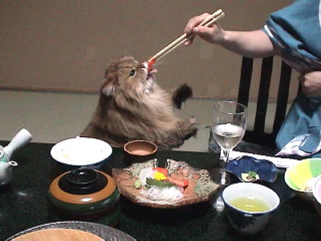 ルソー「まずは、お刺身チェックからだな。サーモン、はぐはぐ・・・。」 今回は、お刺身もちょっとばかり寂しかった。 |