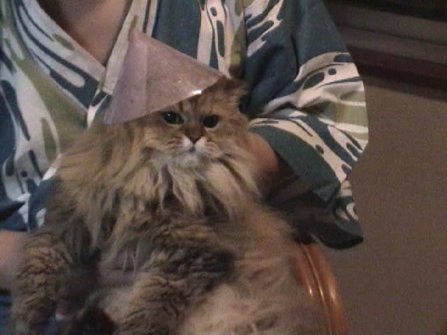 お料理に付いていた飾り・・・ ちょっとかぶせてみました。 ルソー「余は満足じゃ!。」 良い子はマネしないでね。 |