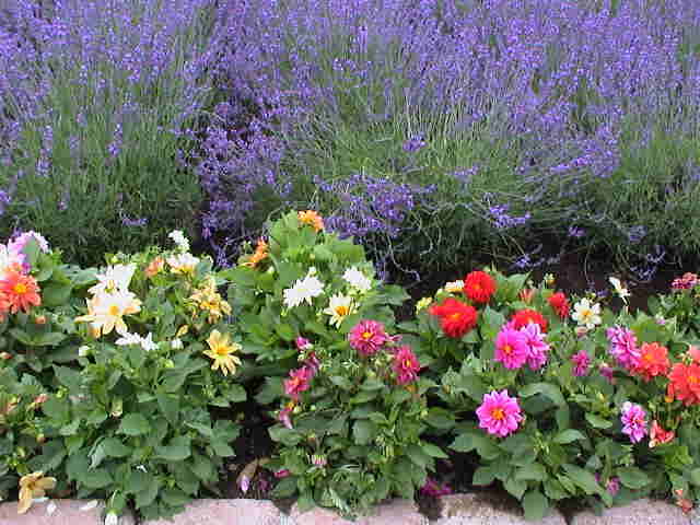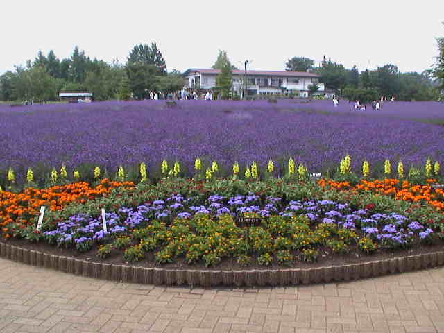 ラベンダー畑の周りには、色とりどりの花が咲いています。 |