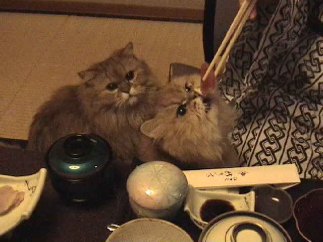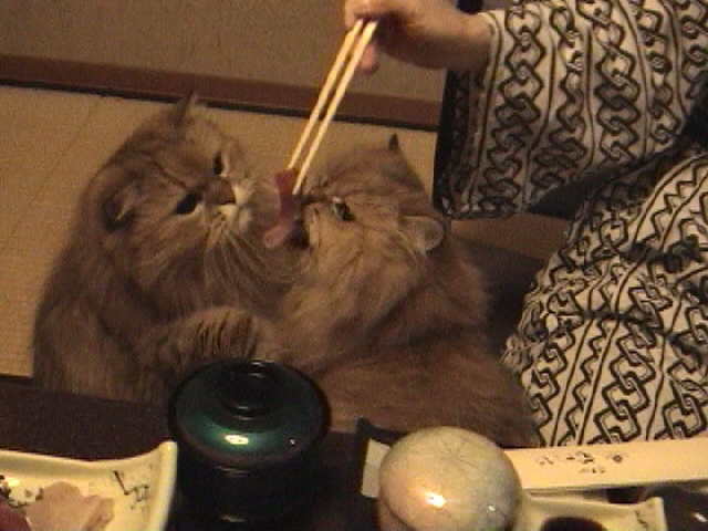 クロード「しかも、お刺身がおいしい。ハグハグ。」 ルソー「ううっ。今回は、クロちゃんに先を越されてしまった・・・・。」 |