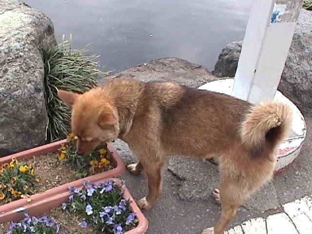 犬「う〜ん。いい香り。ムシャムシャ。」 どこからともなくやって来たワンちゃん。観光というより、散歩を楽しんでいるようであった。 |