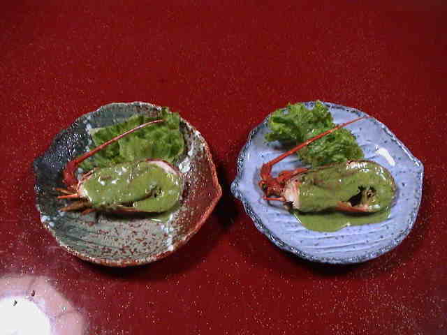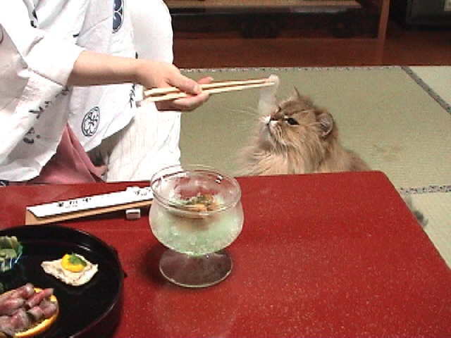 ルソー「今日は、お刺身がたくさんあるね。どれどれ・・・1品ずつ運ばれて来るから、早く食べろだって?ボクたちは、ゆっくり味わって食べるぞ。」 |