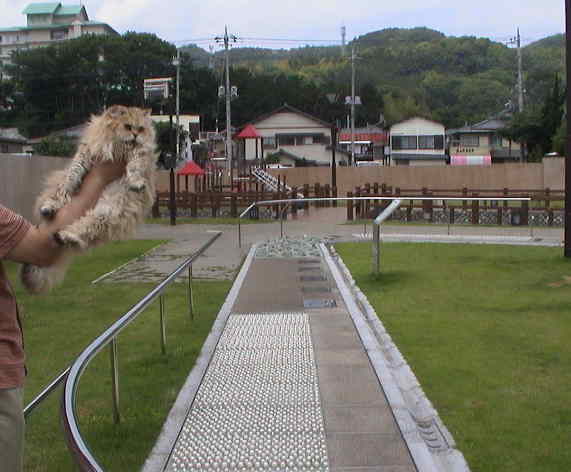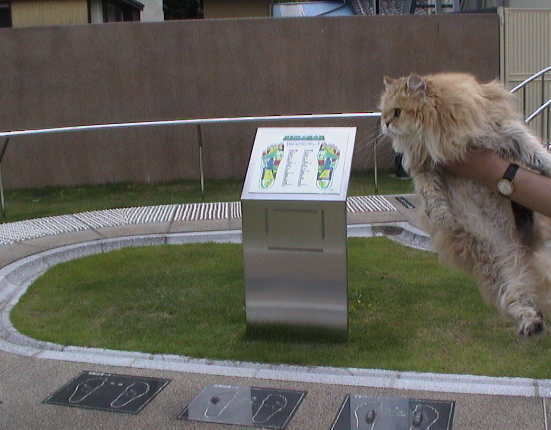 モネ「乗り気じゃないのね。ところで、ここはどこ?ランニングコースなの、これ?」 いいえ、108mある健康遊歩道です。靴をぬいで裸足で歩かなければならないのです。 |