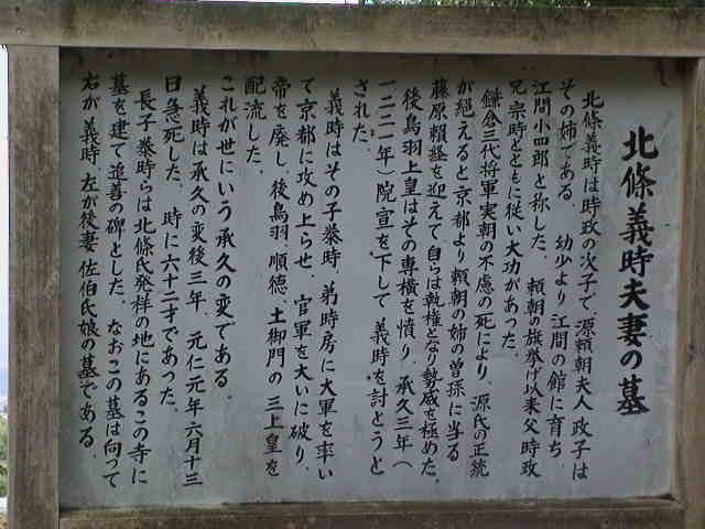 北条義時夫妻の墓前にて ルソー「えっ?1200年頃のおねーさんは、義時の策略により、鎌倉で討死した?」 モネ「そして、その数年後、娘は北条に嫁いでいった。・・・ありがちな話ね。池でネッシーに襲われた話も付け加えてね。 ところで、義時は妻に毒殺されたのではなかったのかしら?」 |