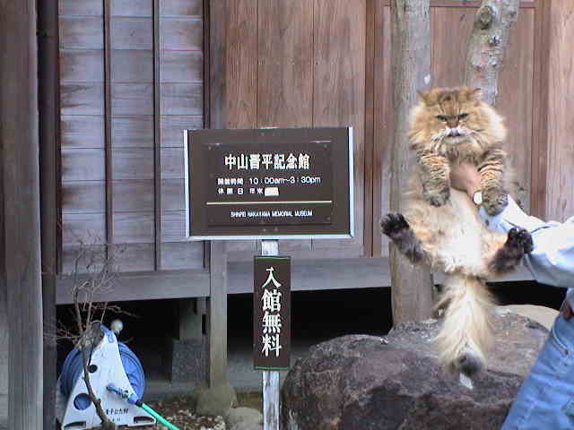 園内にある、中山晋平記念館の前にて。 ルソー「入館無料。よし、入ろう! ・・・な〜んだ。もう閉館してるのか。中山さんは、『てるてる坊主』『肩たたき』『シャボン玉』を作曲したんだね」 |