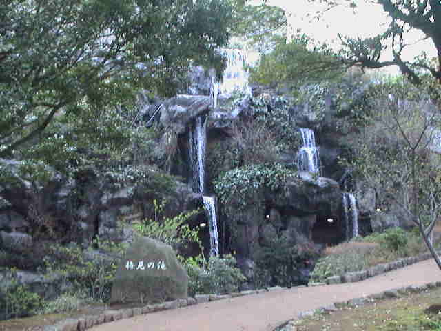 ここは”梅見の滝”。人口の滝です。園内を流れる初川には、ヤマメが棲息し、6月中旬には『ホタル鑑賞の夕べ』が催されます。 |