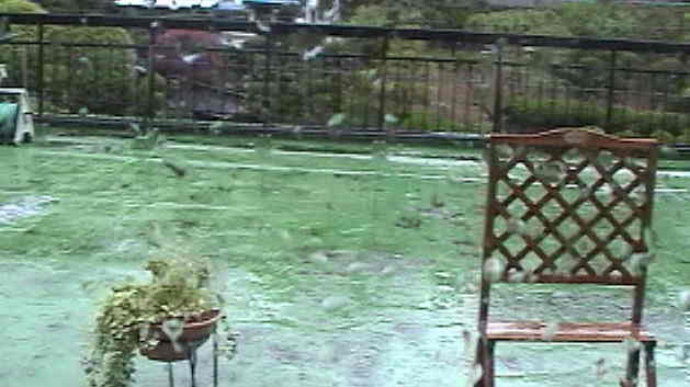 2004年4月27日(火) 暴風雨 今日の旅行は、旅猫始まって以来の悪天候。 こんな日に行楽に出掛けるトホホな私たち。 お部屋の外には、運動場にもなる広いベランダやプールがありました。 |