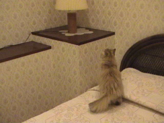 モネ「こんな日でも旅をしなきゃならないなんて、旅猫は大変だわ。観光どころじゃないし、お宿にたどり着くのにも、一苦労だったわね。でも、私、このお部屋に気に入ったわ。 ダブルベッドなのね。ラブラブな私たち夫婦(ルソー&モネ)が大の字になって寝られるわ。それに、そこのカウンターに飛び乗って遊べるし」 |