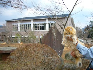 2005年4月3日(日) くもり 山梨県郡内地域産業振興センターで買い物を終え、隣接する御師住宅へ向かいます。 アングル「郡内地域の特産品は、織物、宝飾品、ワインに印伝です。ネクタイが3本で5,000円なんて、安いわ〜。私のスカーフも買って!」 |