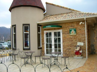 このテラスでティータイムを、と思ってやってまいりましたが・・・ あいにくの雨で中止に。 仕方なく、人間だけが店内でティータイムとなりました。 いちごのパフェやケーキが美味です。 |