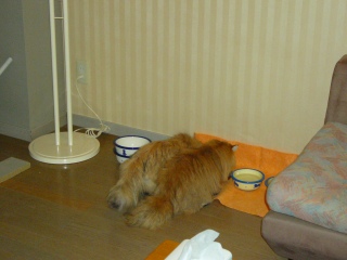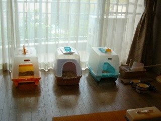 何と! トイレが3個用意されていました。 今回は3匹同伴ということで、お皿も多めに置いてありました。 これでペット料金無料なんて、感激〜。 |