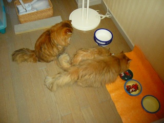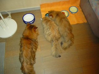 シャガール(右)「どれどれ。お腹いっぱい食べるかな」 モネ(中央)「シャガールったら、今までソファの隙間に隠れてたのに、食事時にはしゃしゃり出て来るのね」 ルソー(左)「シャガール。お皿は3つあるんだから、何もくっついて食べなくても・・・」 |