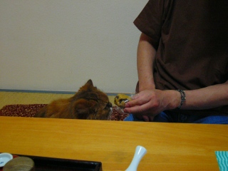 〜 ディナータイム 〜 ルソー(右)「今日のメニューは、まぐろの赤身と、鯛のしゃぶしゃぶと、サーモンだね」 モネ(左)刺身もいいけど、しゃぶしゃぶもいいわね」 |