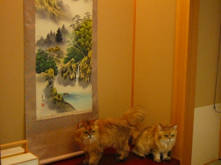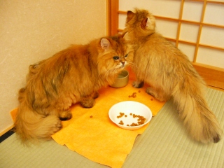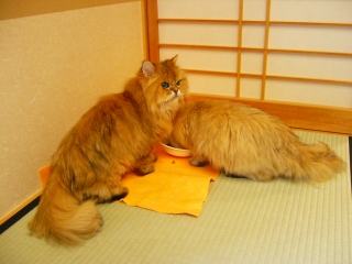 モネ(右)「そういえば、隣の四畳間に気になるものがあったわ」 クロード(左)「そういえば、ボクも・・・」 ごはんは散らかさずに食べましょう。 |