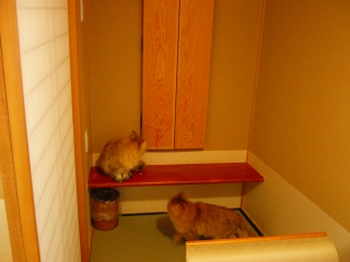 モネ(左)「これ、何なの?」 クロード(右)「こういうスペースが落ち着くんだよね」 これは鏡台です。猫のステップ台ではないので、気をつけましょう。 |