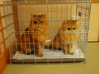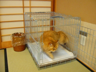 モネ「今日のお部屋は、初めて泊まるお部屋ね。念入りにチェックしなきゃ」 いつものサークルではなく、ケージが用意されていました。 |