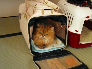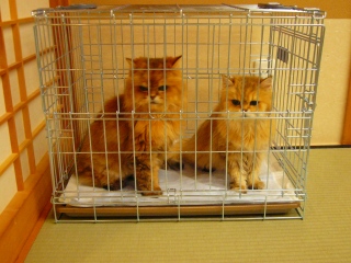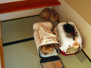 クロード(前)「いつもアッと言う間に旅が終わるね。ボクもキャリーバッグに入って、帰り支度だよ」 モネ(後)「・・・」 |