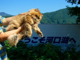 河口湖へ。 クロード「ちょっと無理があるんじゃないの? 一応、ボクたち、河口湖を旅しました。後ろは河口湖。看板は合成じゃないよ」 |