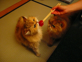 クロード(右)「ハグ! 歯に刺身が刺さって、とれないよ〜」 モネ(左)「歯もないのに! 次は私の番ですからね」 |