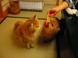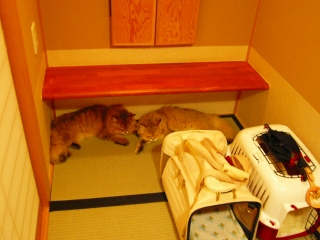 | ファミリーの大黒柱であり、ムードメーカーでもあった、旅猫ルソーのいない旅。すでに何度も宿泊している花水庭おおやさんなら、少しはリラックスしてくれるだろうと思っていましたが・・・ 少しばかりではなく、部屋に入ったとたん、二人ともリラックスしていました。心配していたクロードも、今までの旅以上に張り切っていて、これで我が家の旅猫は安泰といったところです。 これからも、旅猫一同、力を合わせてがんばります。 犬だけでなく、猫を同伴できる宿や施設が、もっともっと増えますように! |