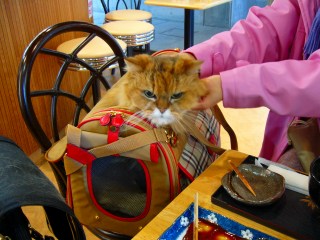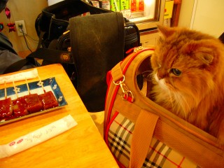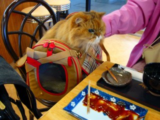 2月6日(日) 晴れ ガーデンプラザの飲食店にて ルソー「入園前のティータイムだ。味噌田楽におしるこに抹茶か。アットホームな店内だな」 |