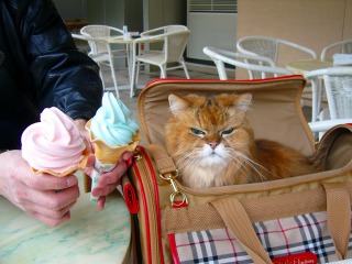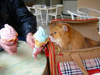 カフェテリア パティオ喫茶にて。 ルソー「ピンクのソフトクリームが桜ソフト、ブルーが青バラソフトだよ」 |