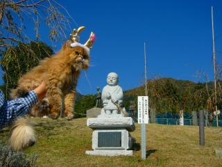 クロード「公園の中に、片道600mのミニSLが走ってるんだね。平日は運行していないけど。とりあえず、箒を持ったお地蔵さんと記念撮影するよ」 |