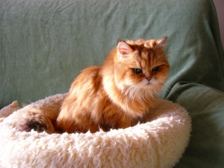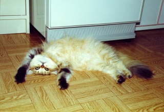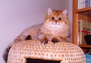 1990年、我が家の最初のお嫁さん、モネは埼玉経由で長野のキャッテリーからやってまいりました。当時、ルソー(2005年没)とカンディンスキー(2001年没)兄弟のために、ショータイプのゴールデンを探していたのですが、モネは「可もなく不可もなく」と言われた、ブリーディングタイプの子でした。小さい頃から口数は少ないけれども活発な子で、「ケケケ」と鳴くので、”ケケちゃん”と呼んでいました。 |