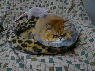 2007年1月、腫瘍の出血が始まり、エリザベスカラーを付けることに。この後、試行錯誤の末、エリザベスカラーよりも自由がきく、介護服を着てもらうことに。1日3〜4回の着替えと消毒、コーミングとマッサージ。この介護服を着て、モネは病魔と戦ったのでした。 |