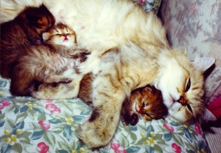 母のモネ、娘のペコりん、あさりは少産系でしたが、アングルは多産系。 一度に6匹も出産した時があります。4歳で引退するまで5回出産。 猫は見かけによらないことを、証明してくれました。 |