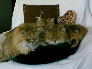 1つのベッドに4匹が入っている・・・そんなことが日常茶飯事。 左からモネママ、ペコりん、シャガール、クロード。こんな状況でも、シャガールは必ず特等席を陣取ってしまうのです。快適な場所には、必ず、シャガールがいるのでした。 |