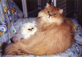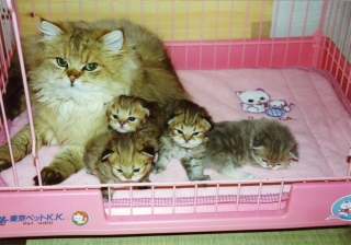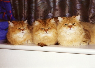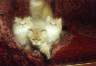 1991年8月20日、ルソーとモネの間に3匹のゴールデンが誕生しました。 アングル(右)、シャガール(中央)、クロード(左)です。 猫も人間も、初めての子猫の誕生に戸惑うばかり。3匹はなかなか成長せず、しばらくの間、人工哺乳で育てました。中でも、シャガールは体が弱く、病院の先生から、育たないだろうと言われていました。 |