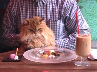 時々、フレンチレストランでお食事を。・・・と言っても、シャガールは外に出ると、大好物でも遠慮してしまうのでした。常に正しいマナーとルールを守り、旅猫としては申し分ない存在でした。 |