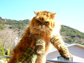 2005年2月、修善寺にて。 旅行の前日には、必ず輸液をして出掛けました。 時折見せる、疲れた表情を見ると、あと何回、旅に出られるのか、考えさせられました。 体重3.5kg。小柄だった父猫ミロ君と同じ体重になっていました。 |