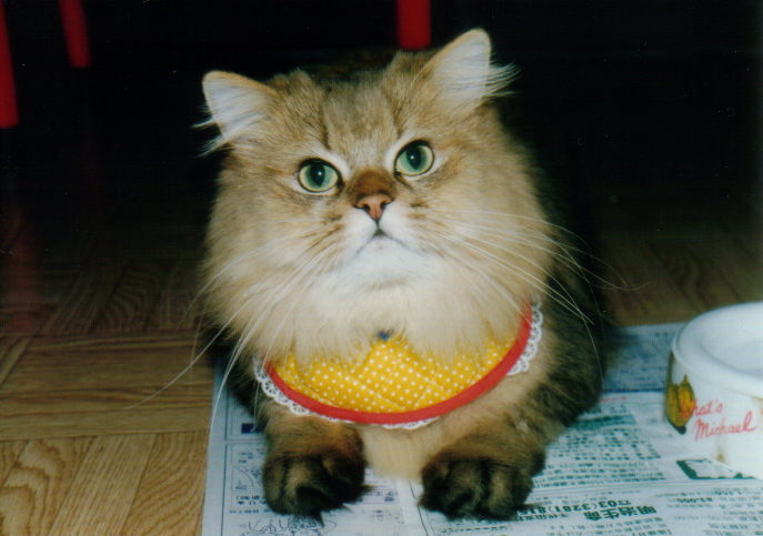 1991年春、エプロンをかけて食事をするルソー。 まだまだあどけない表情ですが、この年の夏、ルソーとモネの間に3匹のゴールデン(アングル、シャガール、クロード)が誕生します。 我が家で生まれた、初めての子猫たちです。 |