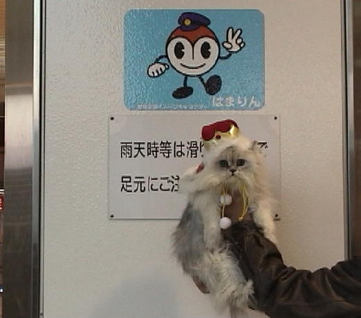 市営地下鉄で、イメージキャラクターの『はまりん』と一緒に。 マコーレー「どう?ボクもどこかのイメージキャラクターに使ってみては? ピースはできないけど。」 |