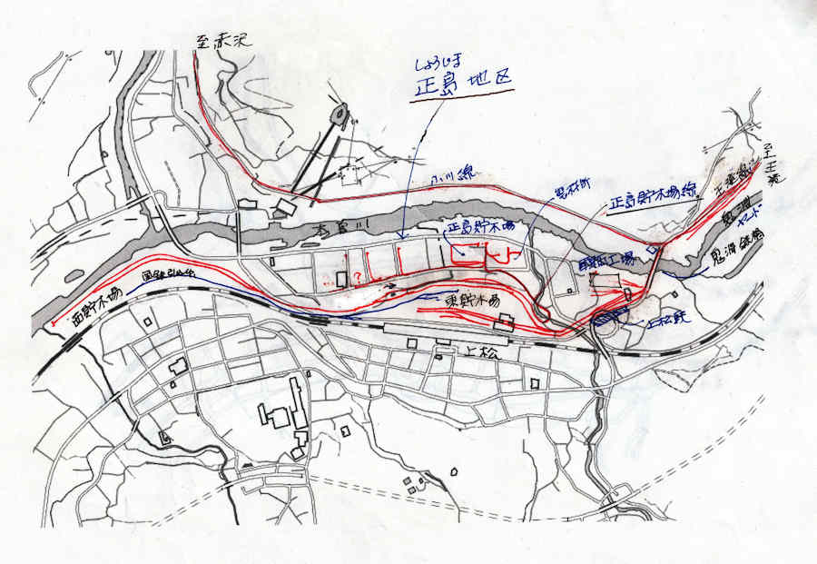 | まずは下のマップをご覧ください(なんと手書きで)調べて送ってくれました。写真と合わせてご覧になると、分かりやすいと思います。木曽森林鉄道の上松駅は、国鉄上松駅の北側にあり、西貯木場・東貯木場・正島貯木場からの3線が合流した先にありました。とても合理的にレイアウトされていたことが分かります。工場もここにあり、出発点としては、条件がそろっていました。なお、マップは真北が大幅にずれており、実際は90度左に縦にしないと、正格な地図にはなりません。文字入れのため分かりやすく書いてもらったためです。 ★注: 小川線がまだ走っていた1966年の上松駅近辺のマップです。 |