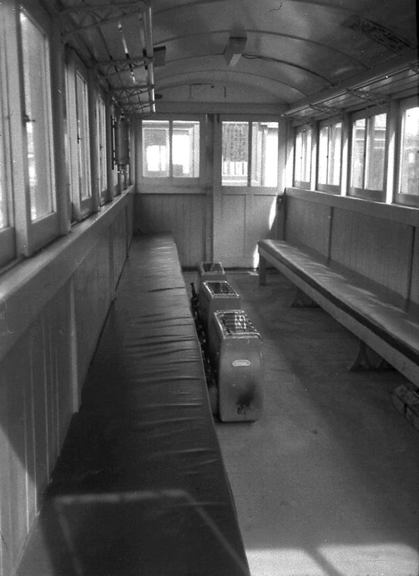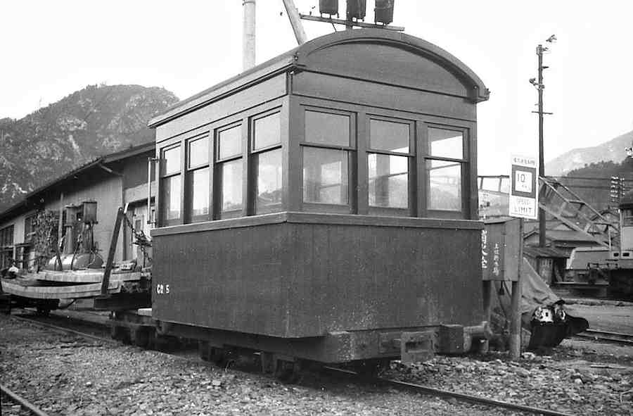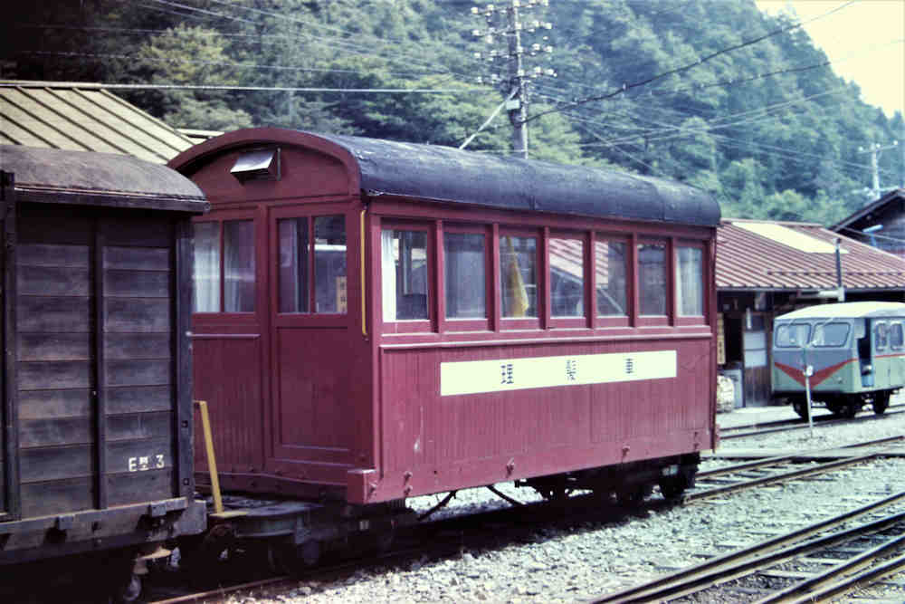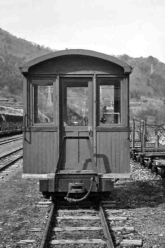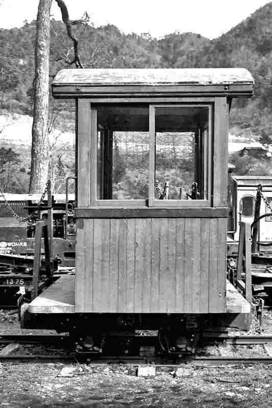 | これまた分からない車両です。車掌車ですが正式には「制動車(カブース)」と言うみたいです。長い貨物を監視する車掌車で、手動のようですがブレーキを備えています。ということは、全客貨車にブレーキホースを繋いでいたということです。これはやはり林野庁の管轄下だからこそでしょう。 |